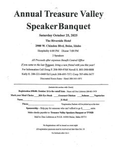 Join us for the Annual Treasure Valley Speaker Banquet on Saturday, October 25, 2025 at The Riverside Hotel in Boise, Idaho.