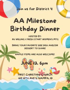 Celebrate recovery milestones with us at the District 4 AA Birthday Dinner! 🎉 Join RU Willing & Fresh Start Women’s Meeting on June 13 at 6pm in Nampa for a night of fellowship, gratitude, and community. Bring your favorite side dish or dessert to share, enjoy great company, and take part in fun raffle opportunities. Let’s honor sobriety together!