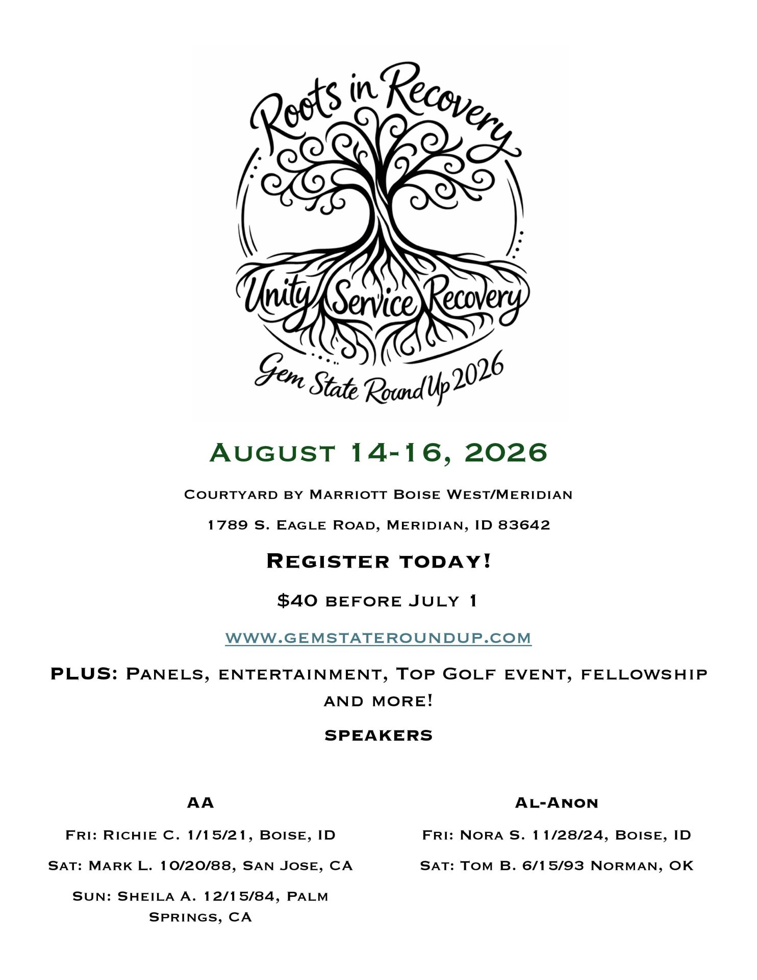 Get ready for an unforgettable weekend of recovery, unity, and fellowship at the Gem State Roundup 2026! Join us August 14–16 at the Courtyard by Marriott Boise West/Meridian for inspiring speakers, engaging panels, entertainment, and even a Top Golf event. Connect with others, grow in your program, and celebrate recovery in a welcoming and energetic atmosphere. Register early and be part of something truly special!