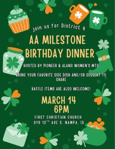 Join District 4 for a joyful evening of connection, gratitude, and celebration at our AA Milestone Birthday Dinner!