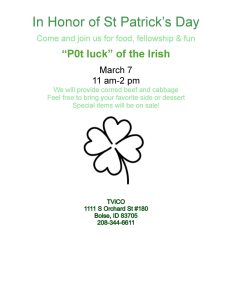 Join us for a festive “Pot Luck of the Irish” as we come together to share laughs, good company, and delicious dishes.